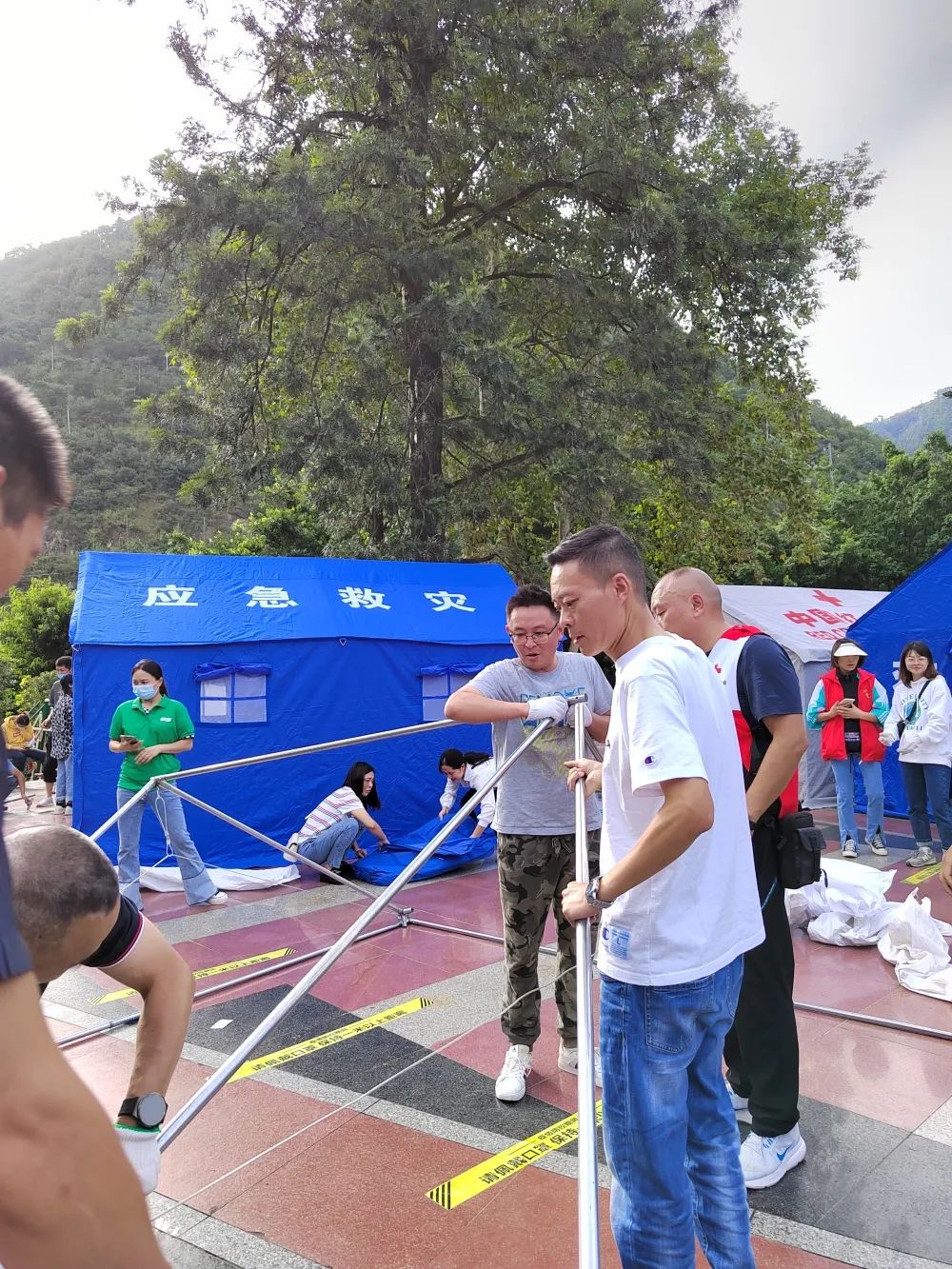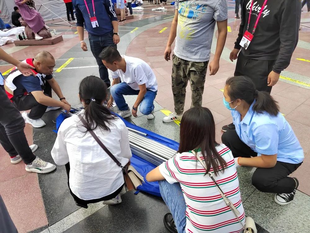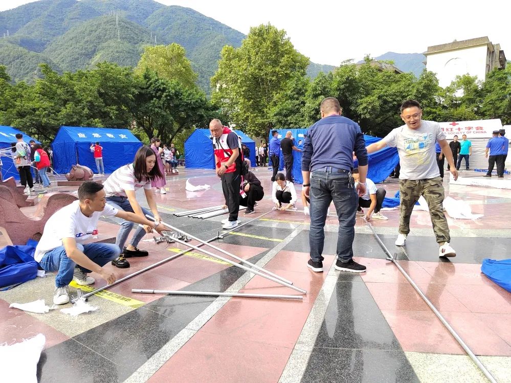 “j9国际站官网入口后援一分队”协助震后安置点搭建帐篷及铺设折叠床
