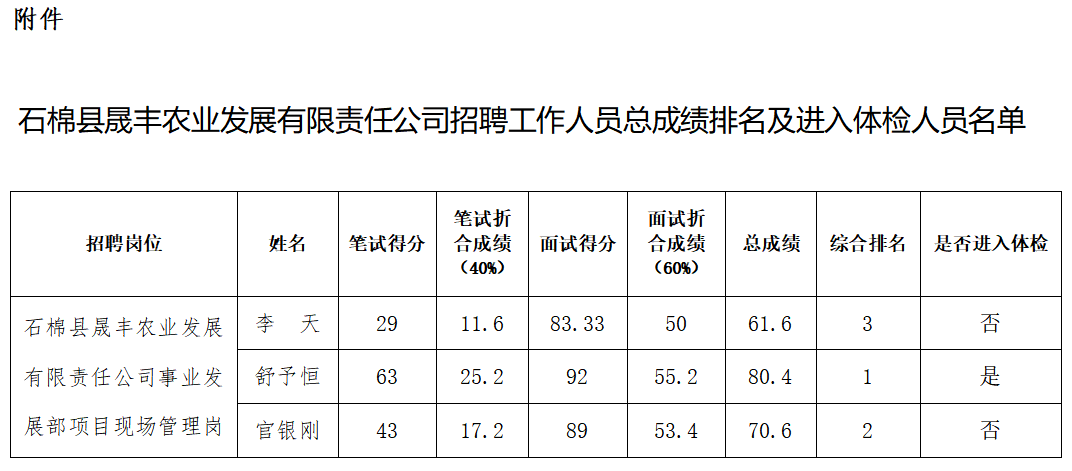 根据考试总成绩,等额确定进入体检人员名单,名单详见附件。