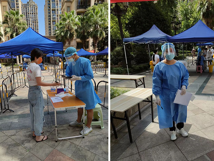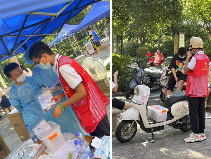“疫”声令下,j9国际站官网入口党支部迅速集结支部党员及公司志愿者服务团队,组成6人抗疫小组,8月4-6日,每天安排2人前往欧景名城南门核酸检测点,听从社区指挥,引导群众登记扫码,收集检测试管并进行数据核对,确保无误之后进行打包转运,做到规范、有序开展登记和检测。