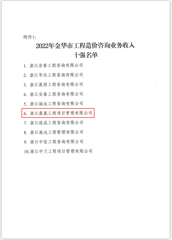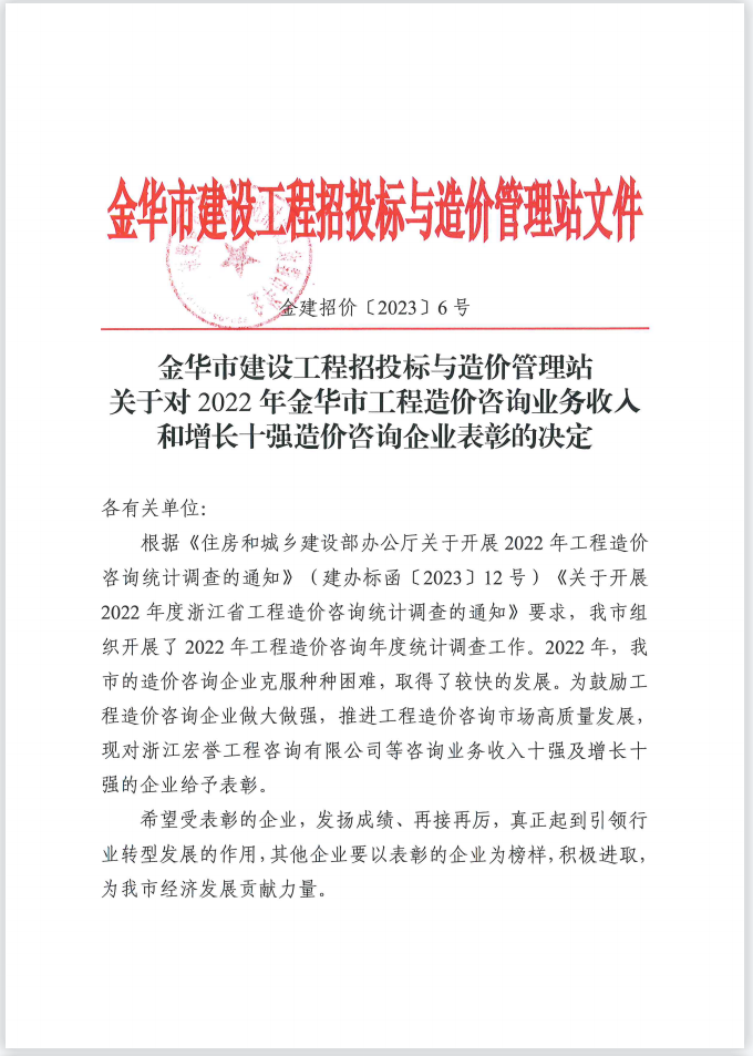 5月10日,市造价管理站发出通知,对2022年度金华市咨询业务收入十强及增长十强的企业给予表彰,我公司荣获2022年金华市工程造价咨询业务收入十强企业。